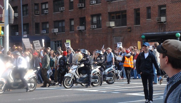 It took a good 2 and a half hours to walk from 11th street to 47th street, where we took a left and started to flow into Times Square. But at this point things started to get weird. Suddenly there were large groups of police rushing to and fro. A half-dozen mounted police clacketed past on horseback. Then a convoy of motorcycles. I was getting uneasy, and just in the middle of telling my musician friend about the ‘kettling’ techniques used by police in the Brooklyn Bridge march he pointed out that suddenly all the police were now carrying large bunches of plastic handcuffs. And then I saw the orange police barrier come out. For different reasons, neither my friend nor I had any desire to be arrested. So we ran for it, hurrying back to 6th ave. We felt sheepish but later I learned that 42 people were arrested on 47th street. It had been a close call.