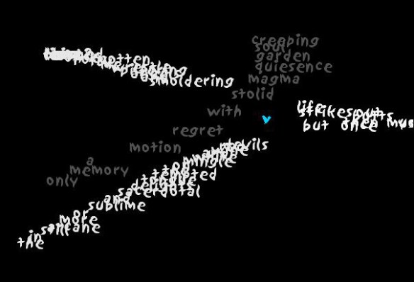 But when I searched for “creative software’ or ‘most creative software’ or ‘fun and creative software’ on Google, I got only the most shockingly sad little salad of results. Not an enticing link anywhere in the first 3 pages. Whereas it seems to me there used to be a great number of such obscure software titles. Some were available as freeware and some you could purchase, and some did some very cool things. I remember one app I picked up somewhere years ago, called Nozzle, that let you load any text into a hose, choose a font and various settings, then press down to spray the words our in whatever patterns you liked. I made some nifty concrete poems out of Nozzle, like this: