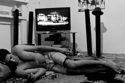 and legs of the young men and the strict – almost claustrophobic – confines of their bare apartment. And these immediate parameters of wall and bone in turn mesh ambivalently with the far wider, faster, interconnected realities activated by their tools for talking, sharing, reading, writing. And given that all of this is occurring in a country defined by theocratic militarism, by simmering social divisions, by a recent history of bloodshed in the streets, ‘what’ – I asked myself – ‘were these men doing?’ What exactly is this a portrait of? What is the meaning of these tools in this place?