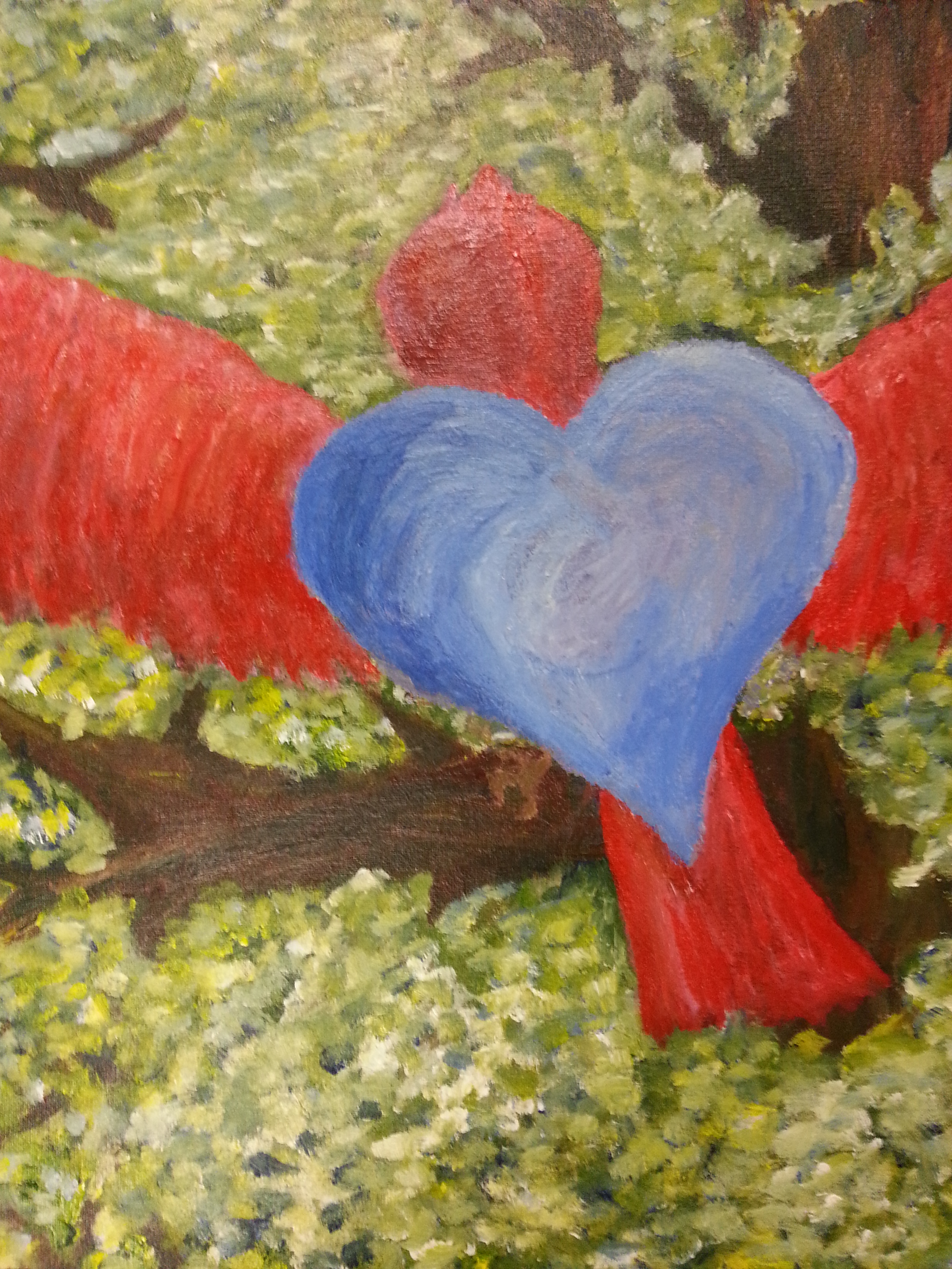 Next from North Point is a mysterious canvas called Love Takes Flight by David W, a bold and impressionistic painting that seems both very familiar and yet strange and intriguing. The form suggests four cardinals lifting a blue heart into a green tree, and yet like a surrealist’s illustration the red and green shapes are also abstract, and the blue heart pulsing with colour suggests both superficial valentines and deeper realms of love in nature and in the imagination.