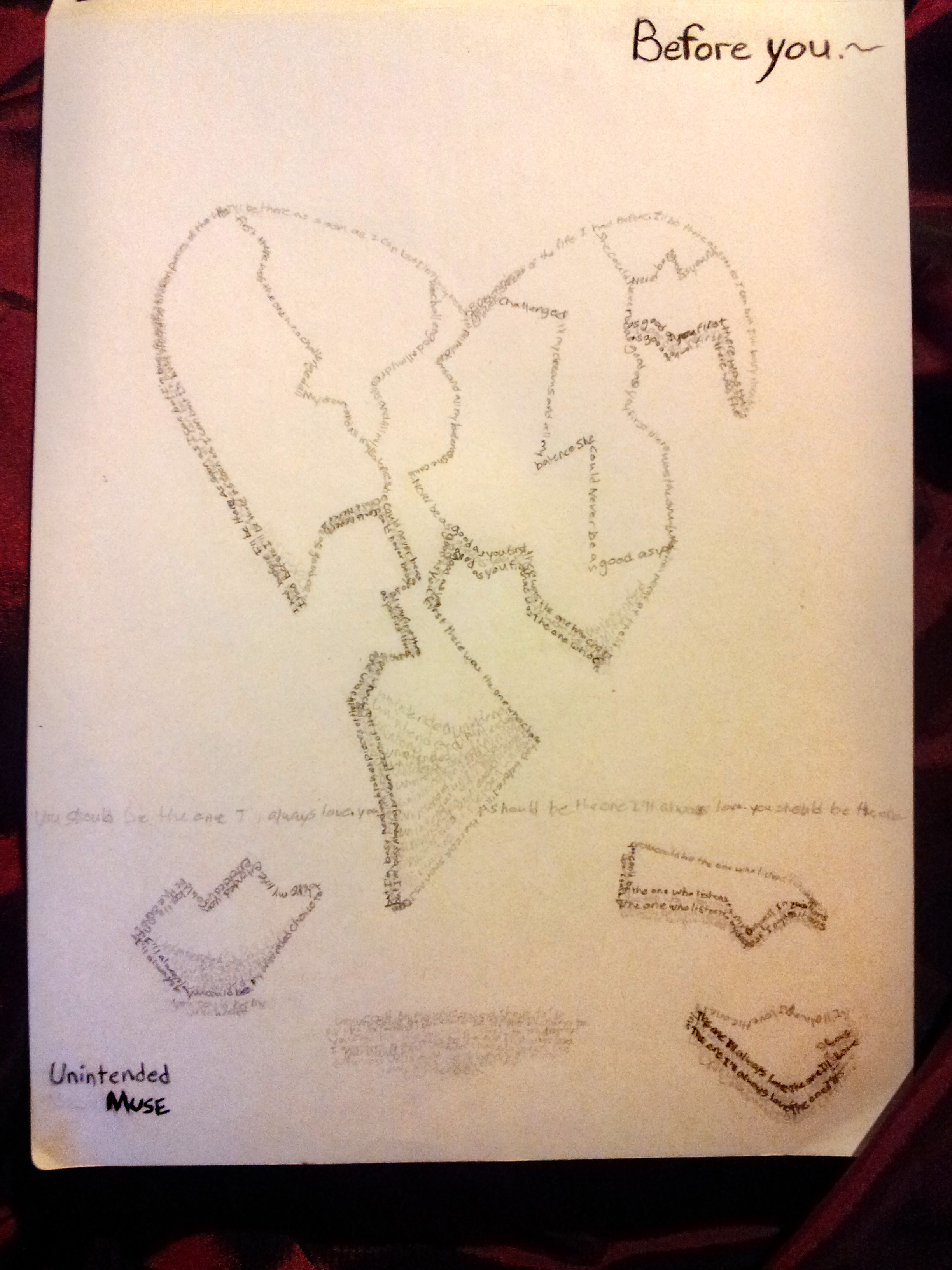 The first song that inspired a Power On drawing was all about love but the second one – Muse’s Unintended – is itself a powerful love song, and that is a very different thing. The drawing, called “…you could be my Unintended Muse” is of a fractured heart. What makes it especially interesting however, is that every element of the drawing is made up of the lyrics to the song, which means that the drawing is more of a concrete poem than a drawing. Even the shading consists of partially erased words, creating an unusual and intriguing visual effect.